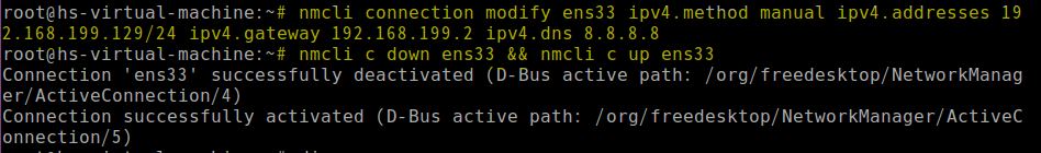 IP4와 관련된 커넥션 정보를 확인하였다. 아까 설정해주었던 192.168.52.110/24로는 네트워크 설정이 되지 않았었는데, 지금은 네트워크 연결이 가능하고 새로운 IP4주소 192.168.199.129/24가 할당되었다.