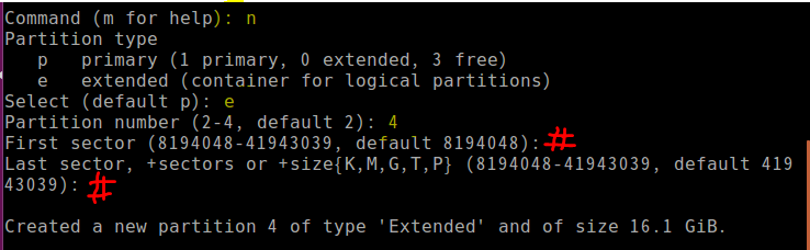 7) n 실행. 확장 파티션 생성.