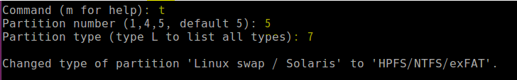 12) t 실행. 5번 파티션을 타입7(NTFS)로 변경.