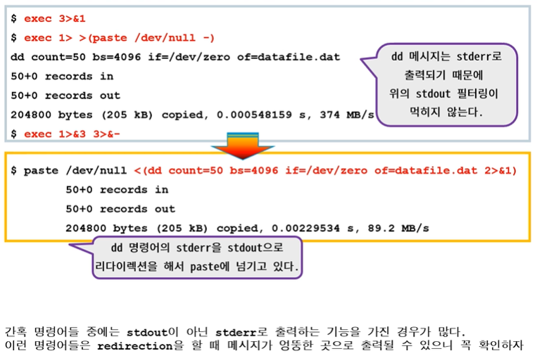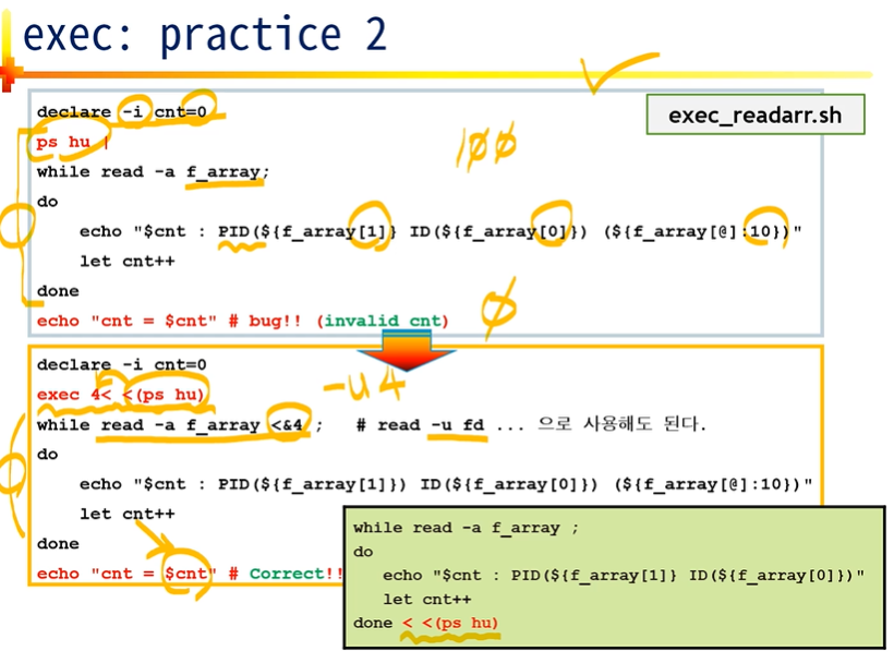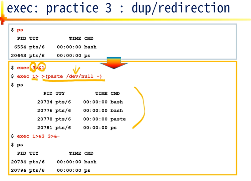 exec #>FILE : 쓰기용 FILE로 오픈. 오픈된 파일은 fd#번을 할당 받는다. 디폴트=1