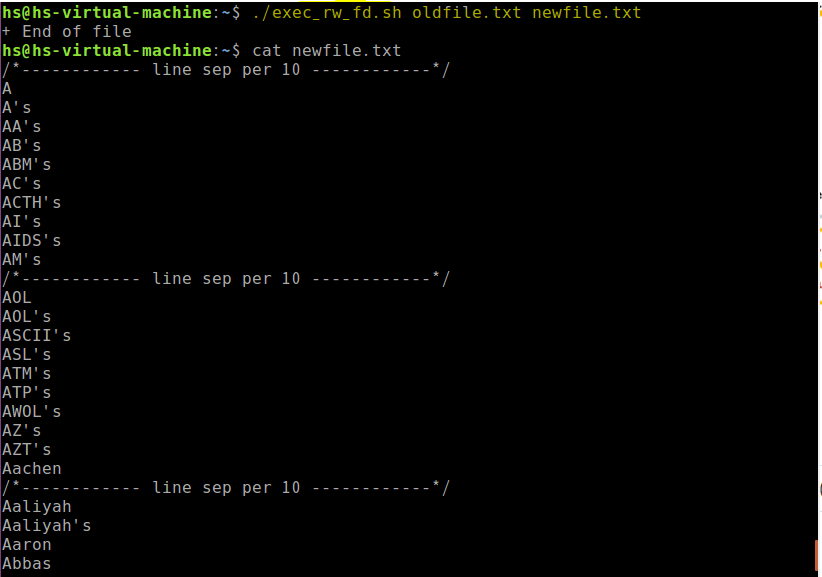 이때 구분선을 18라인씩 하고 싶다면 위 exec_rw_fd.sh파일의 head -18 로 옵션을 넣으면 된다.