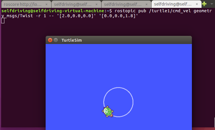 rostopic pub /turtle1/cmd_vel geometry_msgs/Twist -r 1 -- '[2.0,0.0,0.0]' '[0.0,0.0,1.8]'