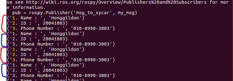 위 명령어를 실행하면 publisher터미널(=터미널#3)에서는 아래와 같이 출력되고