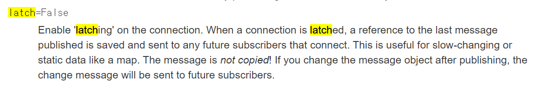 Publisher객체를 생성할 때 latch라는 속성이 있다. 디폴트값은 False인데, True로 해주면, 발행된 마지막 메시지에 대한 참조가 저장되고, 연결된 후에 구독자에게 전송된다.