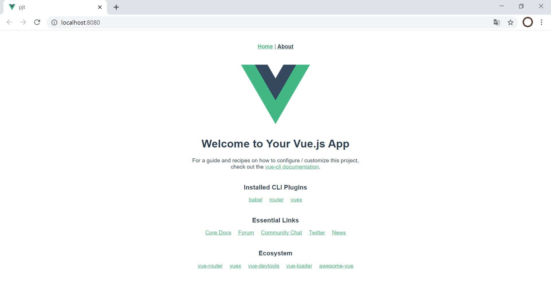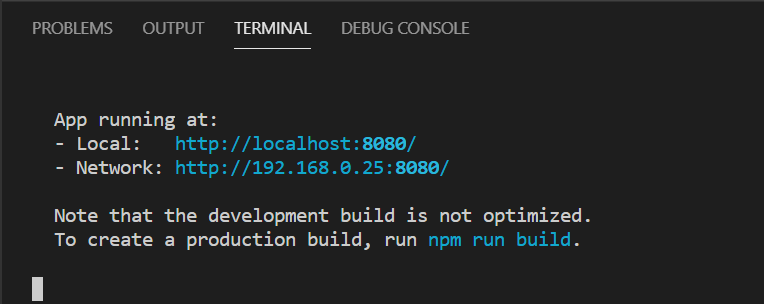 이 두 명령어를 실행하면 위와 같이 결과가 뜨는데, Ctrl키와 함께 url을 클릭하면 vue로 만들어진 예시 사이트가 열린다. 또는 브라우저에서 이 주소를 직접 입력해도 된다.