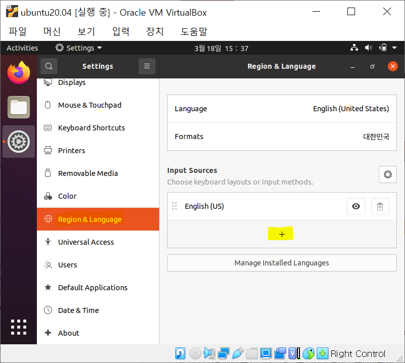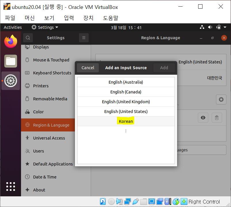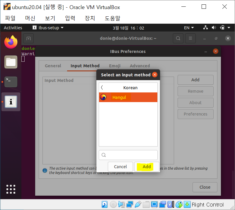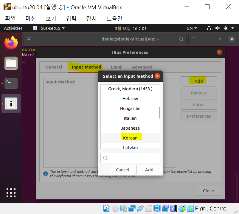 Input Method 탭 - Add 버튼 클릭 - Korean 선택