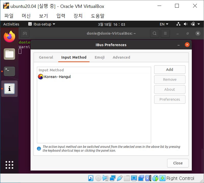 검색을 통해서 ibus-setup을 해줘야 한다는 것을 알았다.