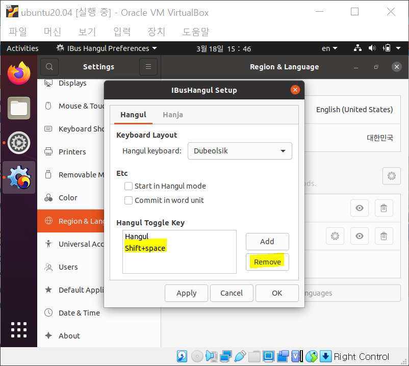 위와 같이 했는데, Korean을 선택했음에도 불구하고 Hangul mode가 켜지지 않아, 한글을 쓰려면 직접 저 Hangul mode를 토글시켜야했다.