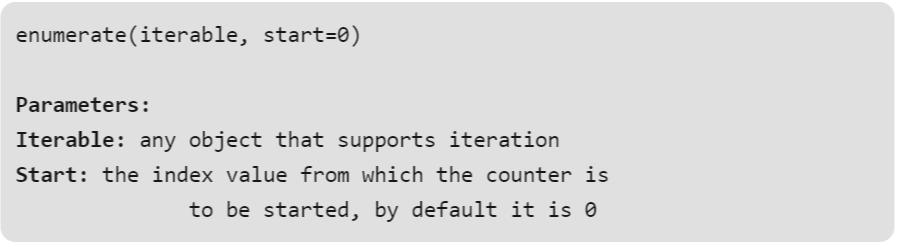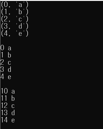 | list = ['a', 'b', 'c', 'd', 'e'] for element in enumerate(list): print(element) print() for index, element in enumerate(list): print (index, element) print() start = 10 for index, element in enumerate(list, start): print(index, element) |