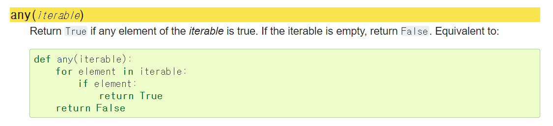 3) any함수 : iterable자료구조의 원소 중 하나의 원소라도 0이 아니면 true를 리턴하는 함수. 비어있거나 전부 0이어야 false를 리턴한다.