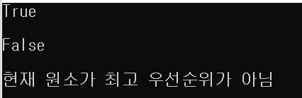 # ex3 (프린터 문제 소스코드 이용) priorities = [1, 1, 9, 1, 1, 1] queue = [(i,p) for i,p in enumerate(priorities)] cur = queue.pop(0) if any(cur[1] < q[1] for q in queue): print("현재 원소가 최고 우선순위가 아님") else: print("현재 원소가 최고 우선순위가 맞음") print() |