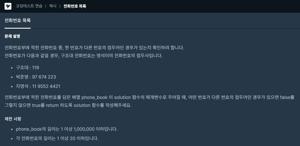 처음에 문제를, 한 번호가 다른 번호에 속해있는지 확인하는 문제로 착각해서 잘못 풀었었다.