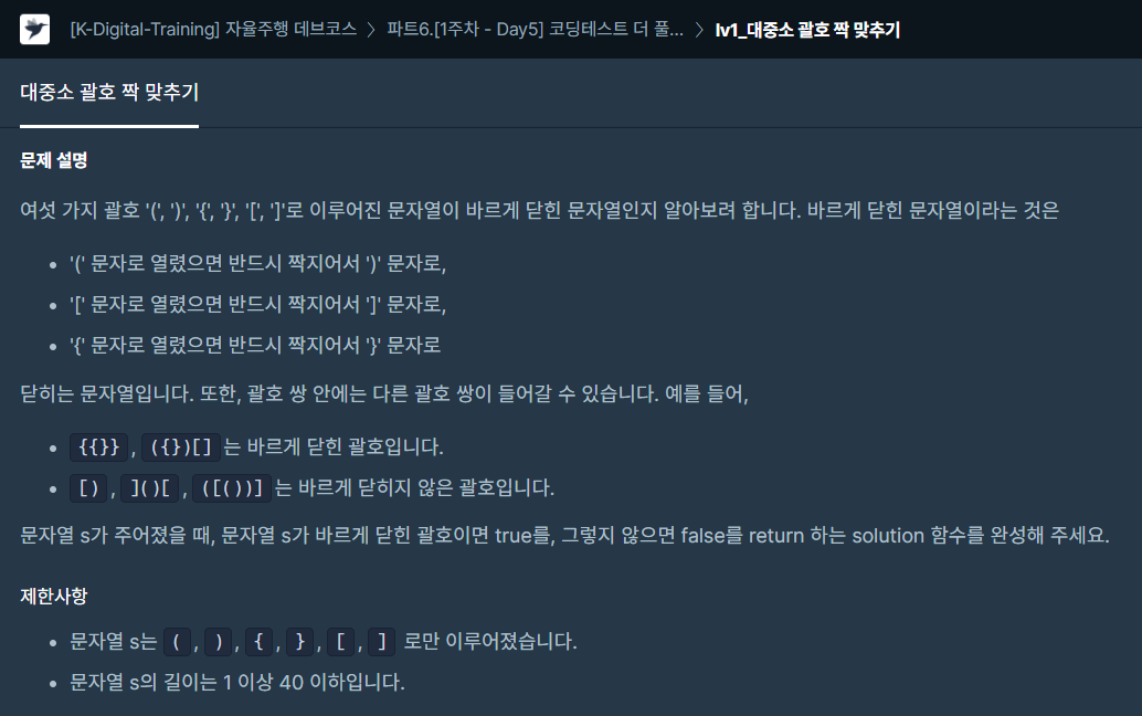 def solution(s): stack = [] match = {'(':')', '{':'}', '[':']' } for x in s: # 여는 괄호 if x in match: stack.append(x) # 닫는 괄호 else: if not stack: return False if match[stack.pop()] != x: return False