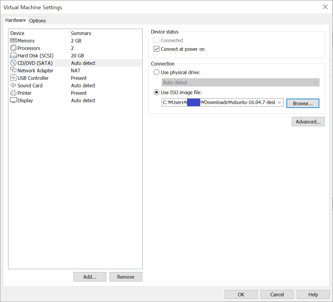 CD/DVD (SATA)탭에서 Connection의 두번째 옵션 Use ISO image file을 선택하고 iso파일의 저장 위치를 Browse하여 입력한다.