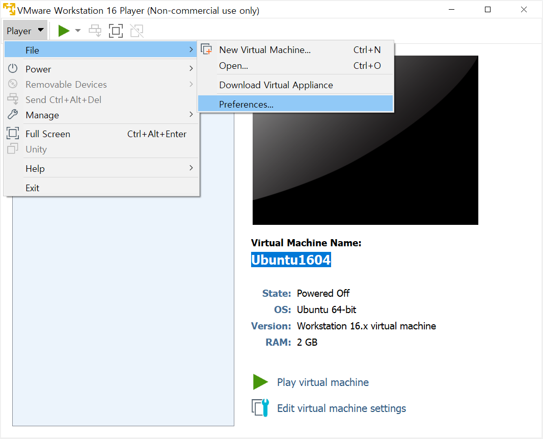 VMware의 Player - File - Preferences를 클릭한다.
