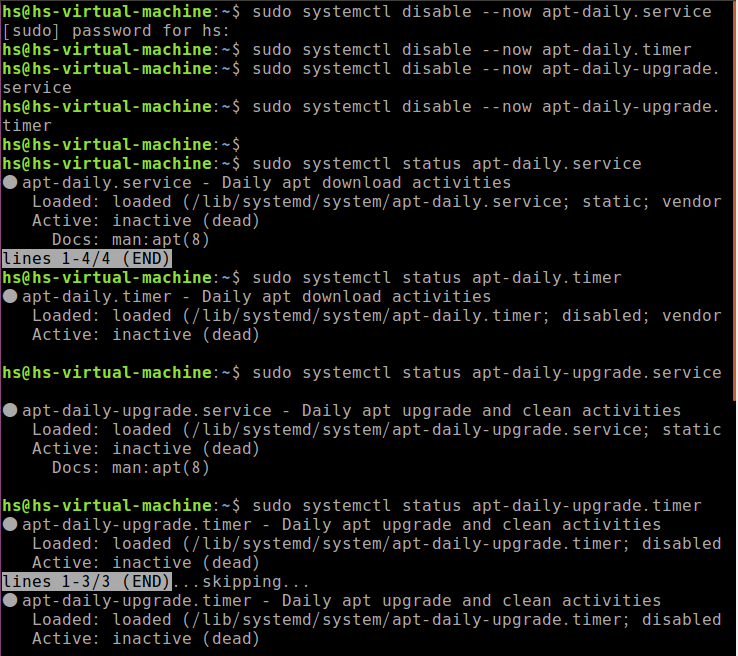 | sudo systemctl status apt-daily.service sudo systemctl status apt-daily.timer sudo systemctl status apt-daily-upgrade.service sudo systemctl status apt-daily-upgrade.timer |