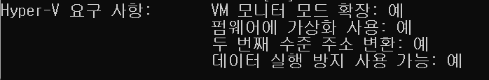 systeminfo 명령어를 입력해서 아래에서 Hyper-V 요구사항의 모든 항목이 '예'인지 확인.